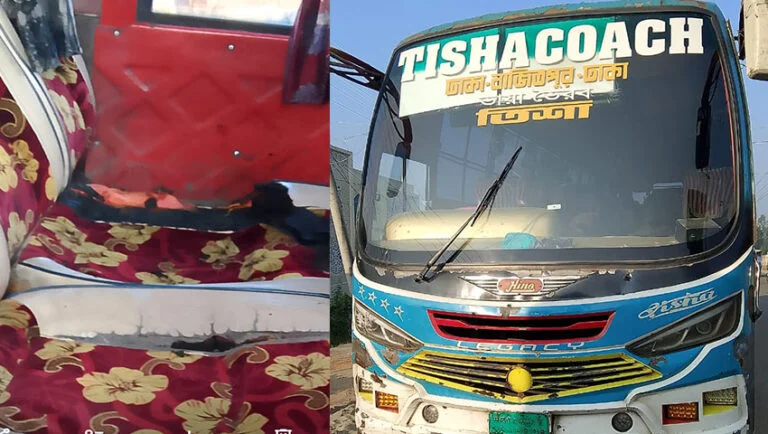 আগুনে বাসটির পিছনের বাঁ পাশের ২নং সিটের উপরের সামান্য অংশ পুড়ে যায়।