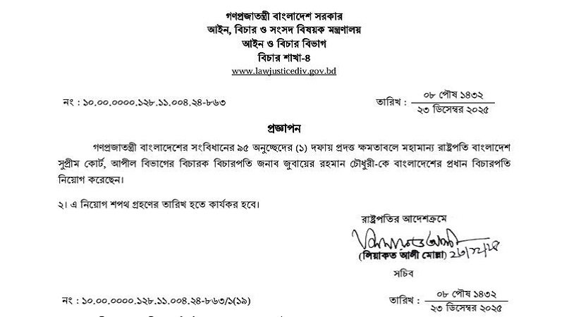 এতে বলা হয়েছে, গণপ্রজাতন্ত্রী বাংলাদেশের সংবিধানের ৯৫ অনুচ্ছেদের (১) দফায় প্রদত্ত ক্ষমতাবলে রাষ্ট্রপতি বাংলাদেশ সুপ্রিম কোর্ট, আপিল বিভাগের বিচারক বিচারপতি জুবায়ের রহমান চৌধুরীকে বাংলাদেশের প্রধান বিচারপতি নিয়োগ করেছেন।