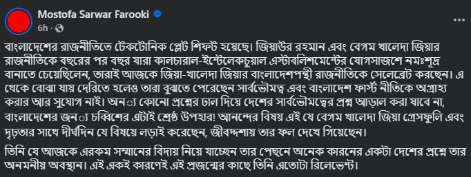 তিনি লিখেছেন, ‘বাংলাদেশের রাজনীতিতে বিশাল পরিবর্তন হয়েছে। জিয়াউর রহমান এবং বেগম খালেদা জিয়ার রাজনীতিকে বছরের পর বছর যারা সাংস্কৃতিক ও বুদ্ধিবৃত্তিক মহলের যোগসাজশে অবজ্ঞা করতে চেয়েছিলেন, তারাই আজকে জিয়া-খালেদা জিয়ার বাংলাদেশপন্থি রাজনীতিকে উদযাপন করছেন। এ থেকে বোঝা যায়, দেরিতে হলেও তারা বুঝতে পেরেছেন- সার্বভৌমত্ব এবং বাংলাদেশ প্রথম নীতিকে অগ্রাহ্য করার আর সুযোগ নেই।’